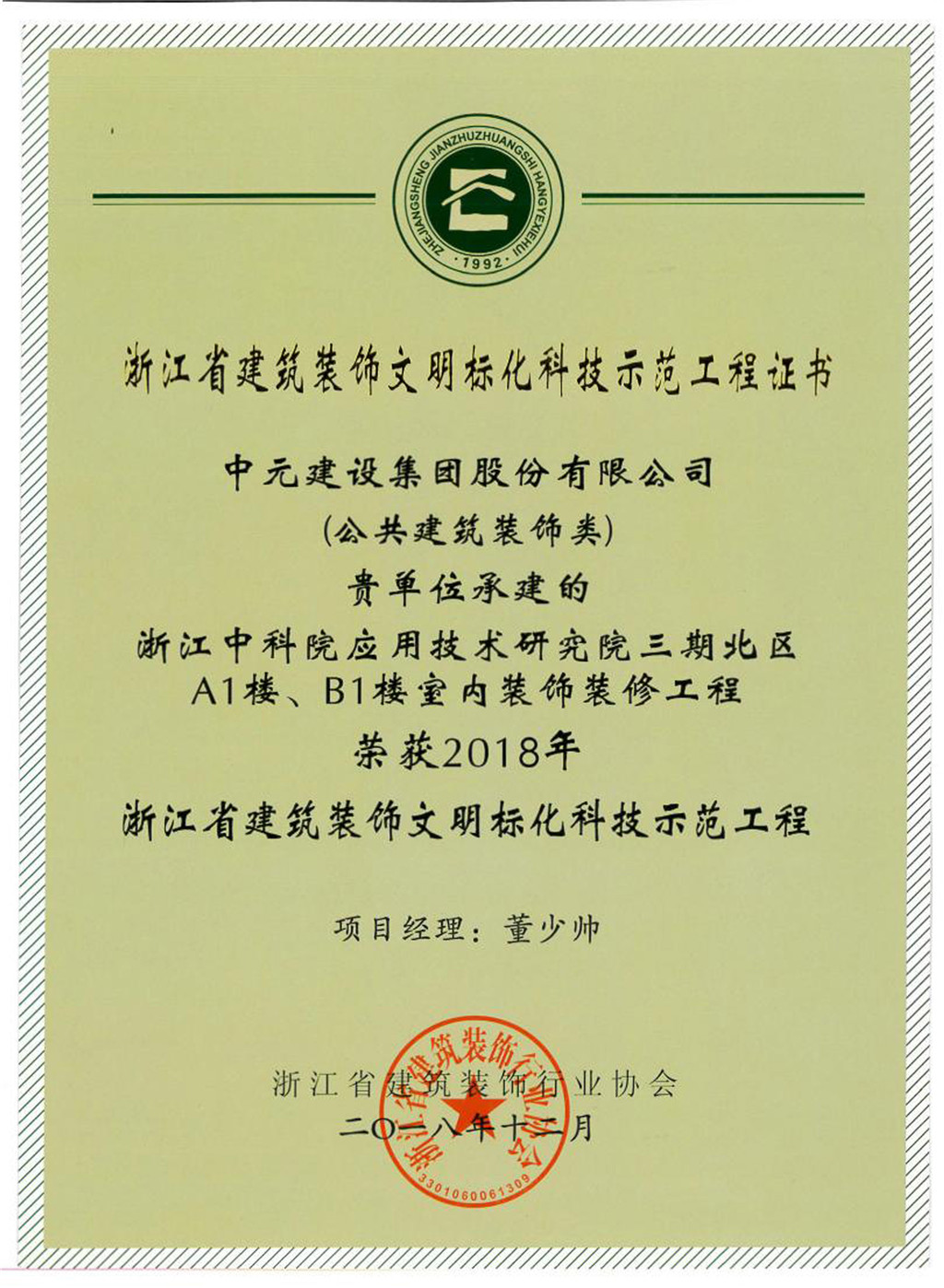 2018年浙江省建筑装饰文明标化科技示范工程(浙江中科院应用技术研究院三期北区A1楼、B1楼室内装饰装修工程)