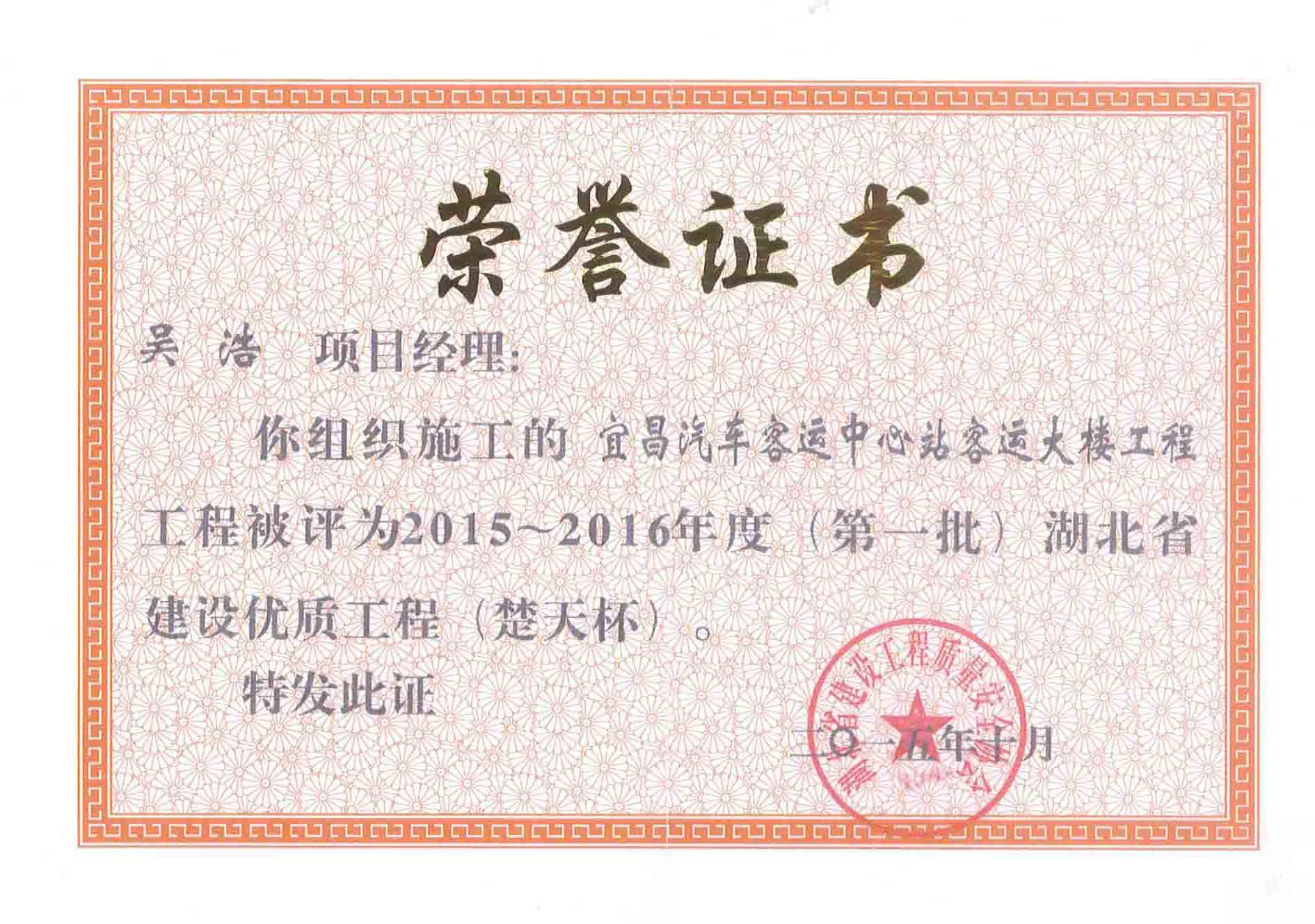 2015~2016年度第一批湖北省建设优质工程(楚天杯)个人