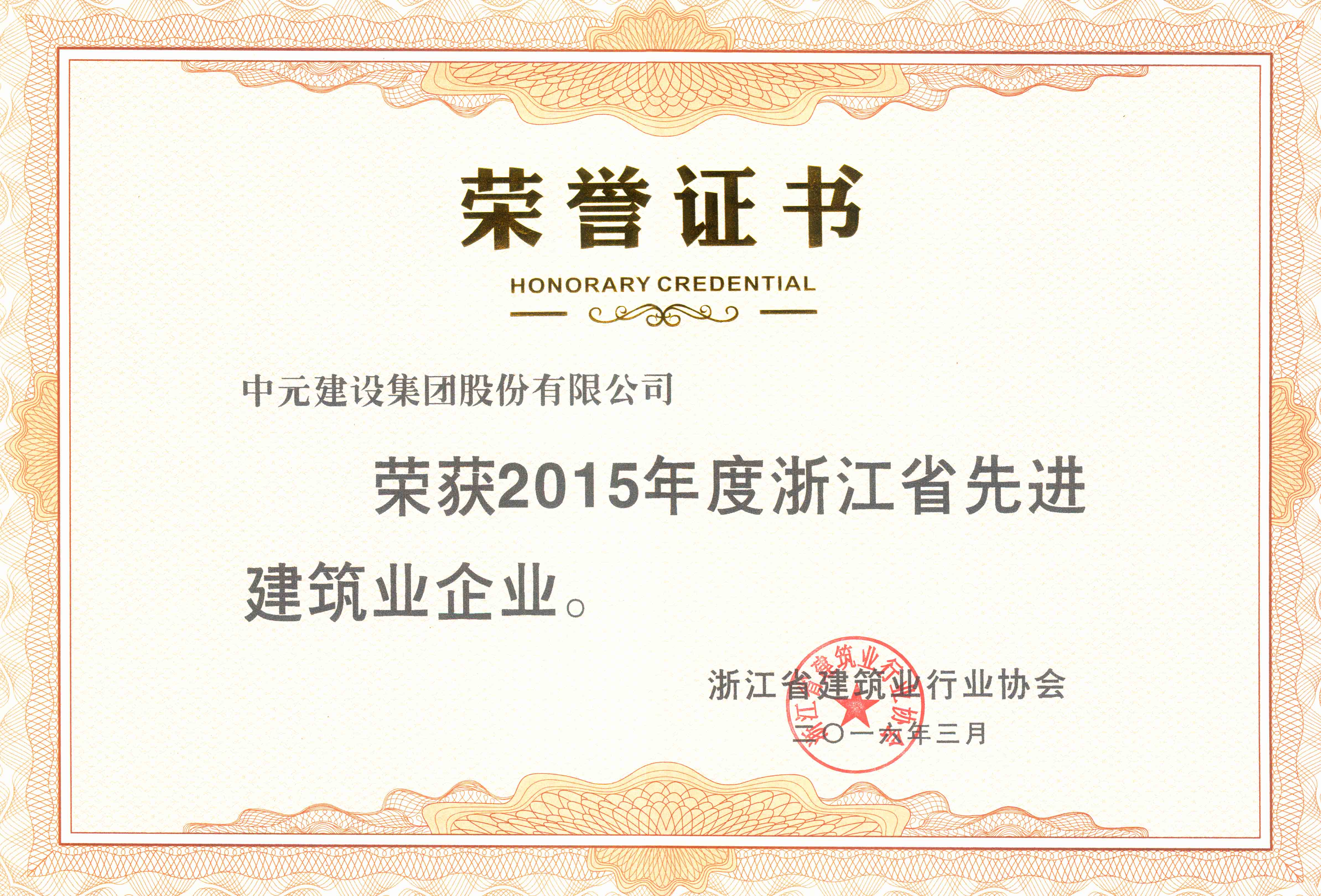 2015年度浙江省先进建筑业企业荣誉证书