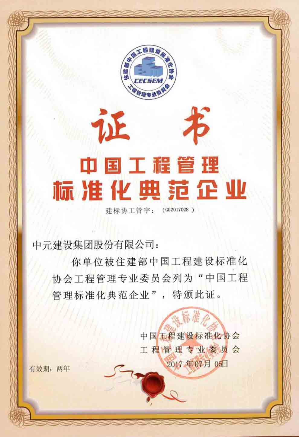 2017年中国工程管理标准化典范企业(证书)