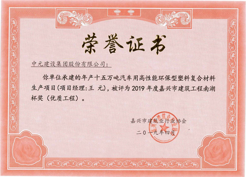 2019年度嘉兴市QY球友会体育官网南湖杯奖(优质工程)年产十五万吨汽车用高性能环保型塑料复合材料