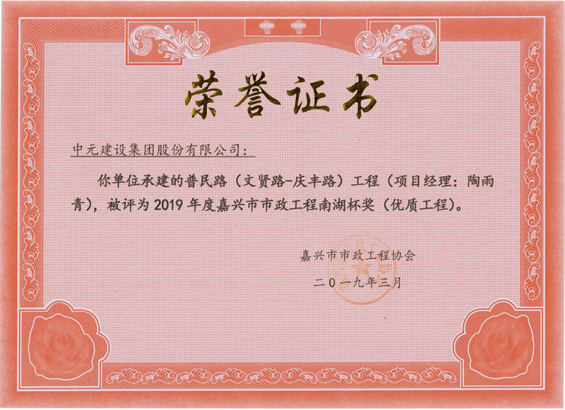 2019年度嘉兴市QY千亿体育南湖杯奖(优质工程)普民路(文贤路至庆丰路)工程