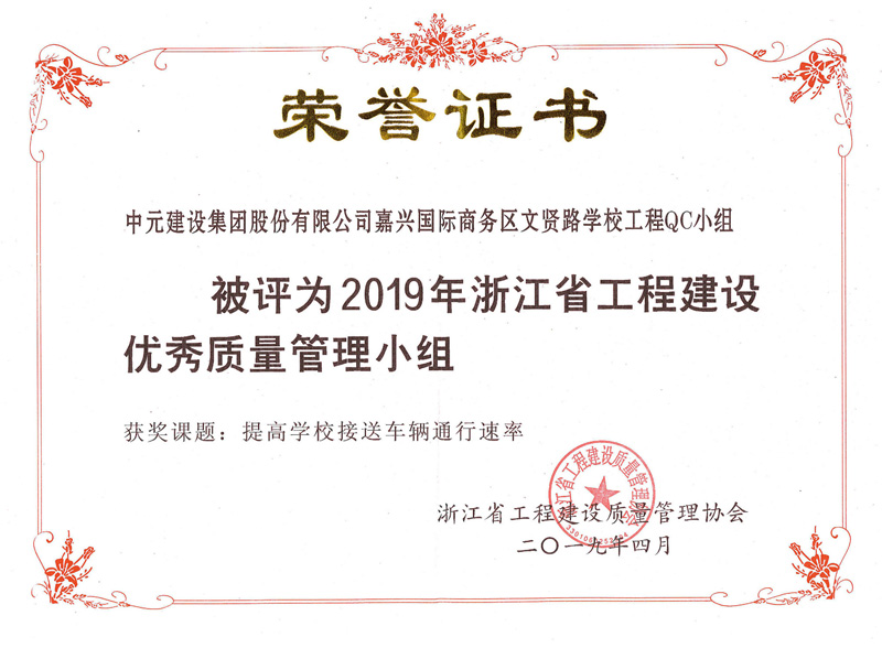 2019年浙江省工程建设优秀质量管理小组(嘉兴国际商务区文贤路学校工程QC小组)