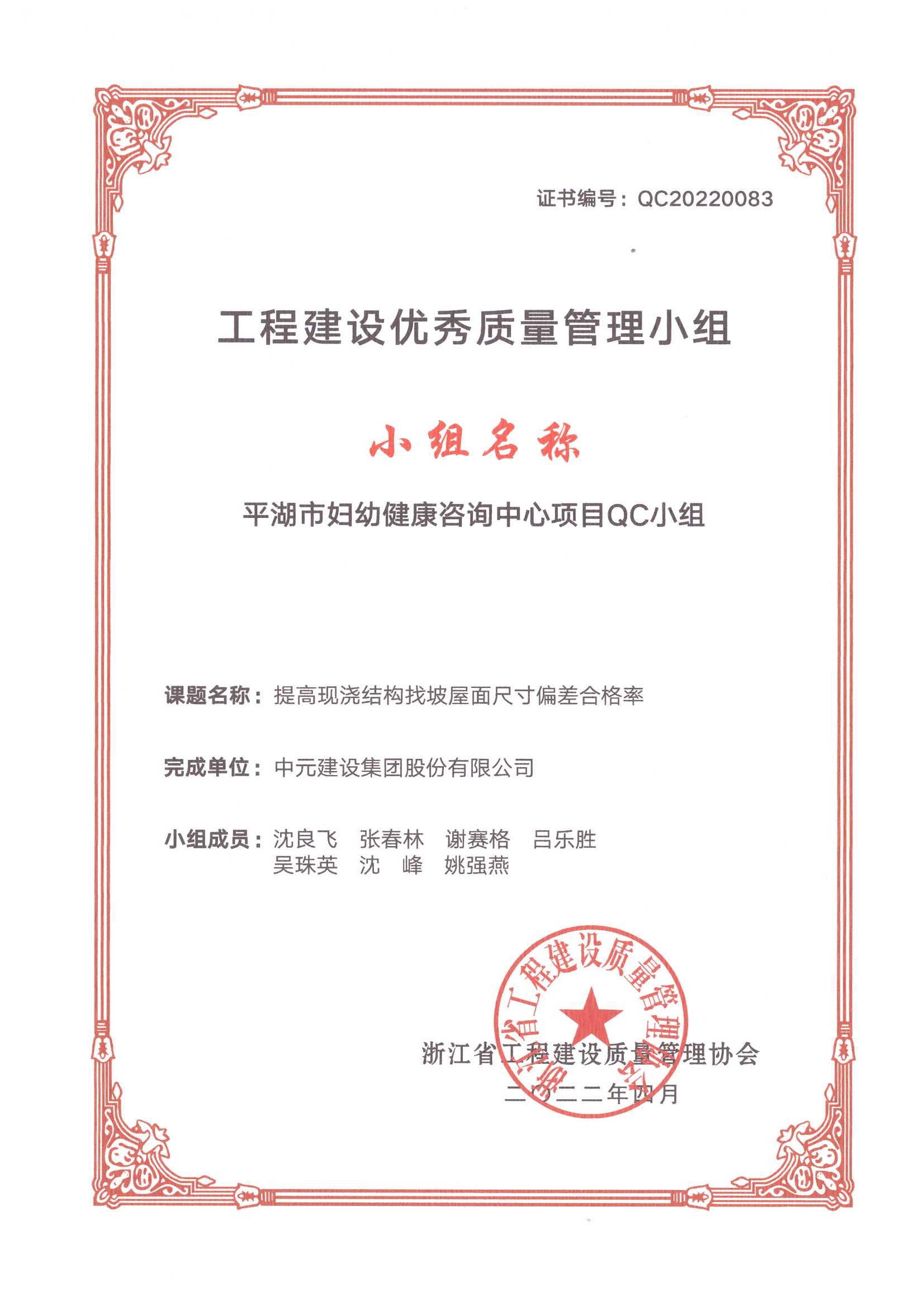 2022年度浙江省工程建设优秀质量管理小组-平湖市妇幼健康咨询中心项目QC小组