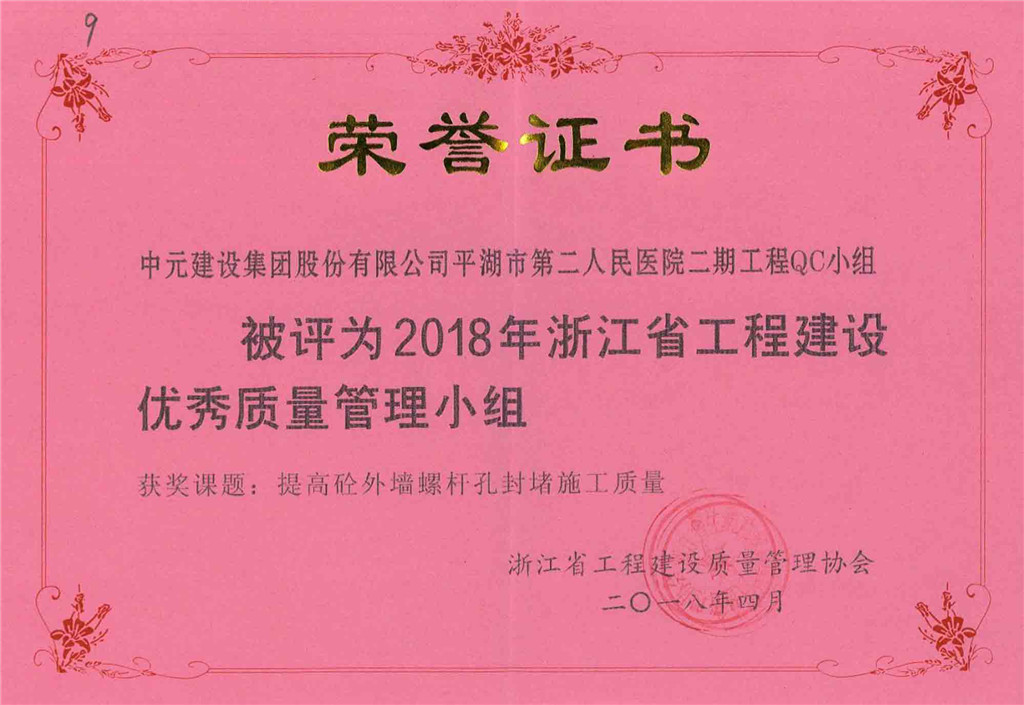 2018年浙江省工程建设优秀质量管理小组(平湖市第二人民医院二期工程QC小组)