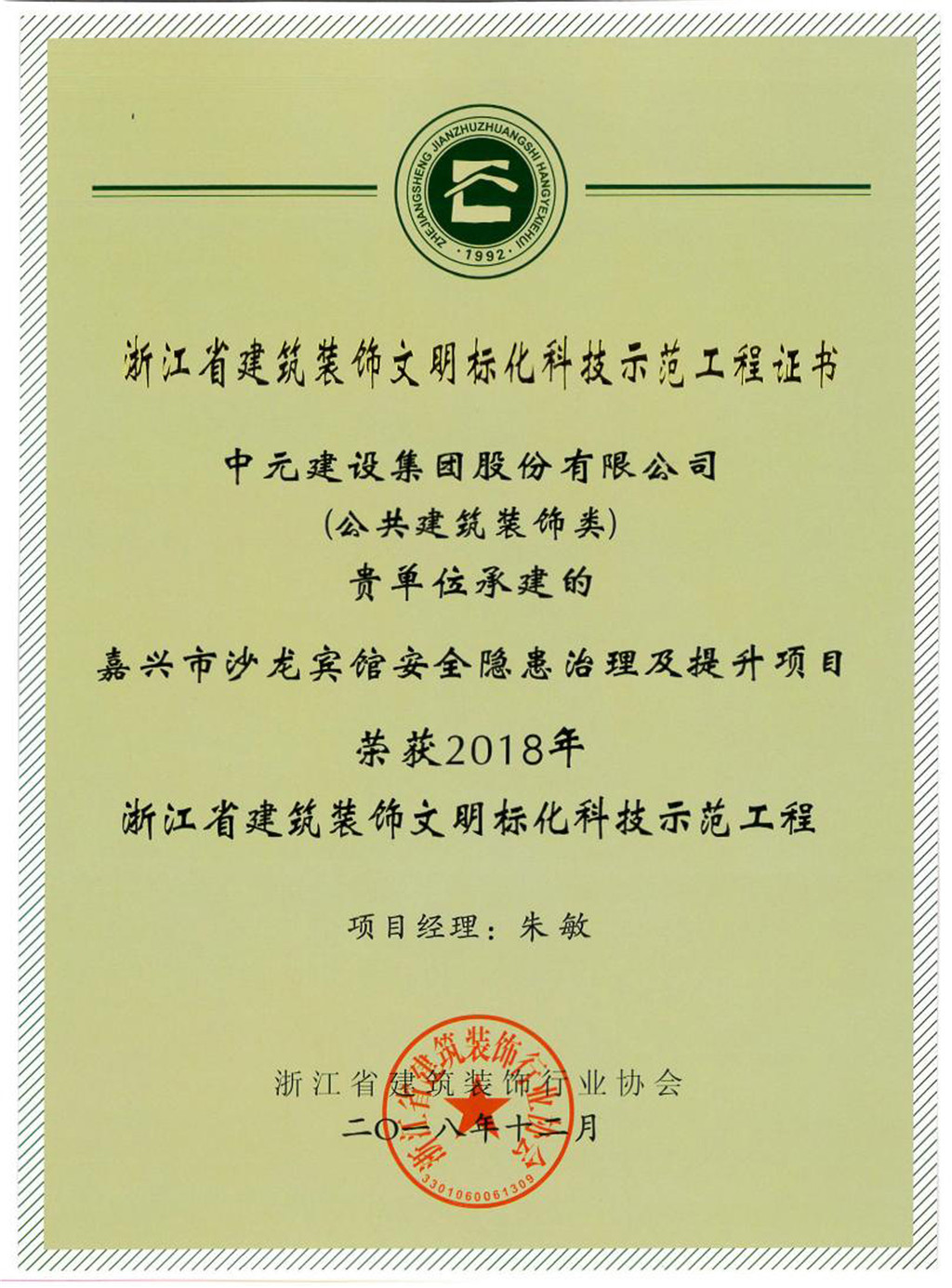 2018年浙江省建筑装饰文明标化科技示范工程(嘉兴市沙龙宾馆安全隐患治理及提升项目)