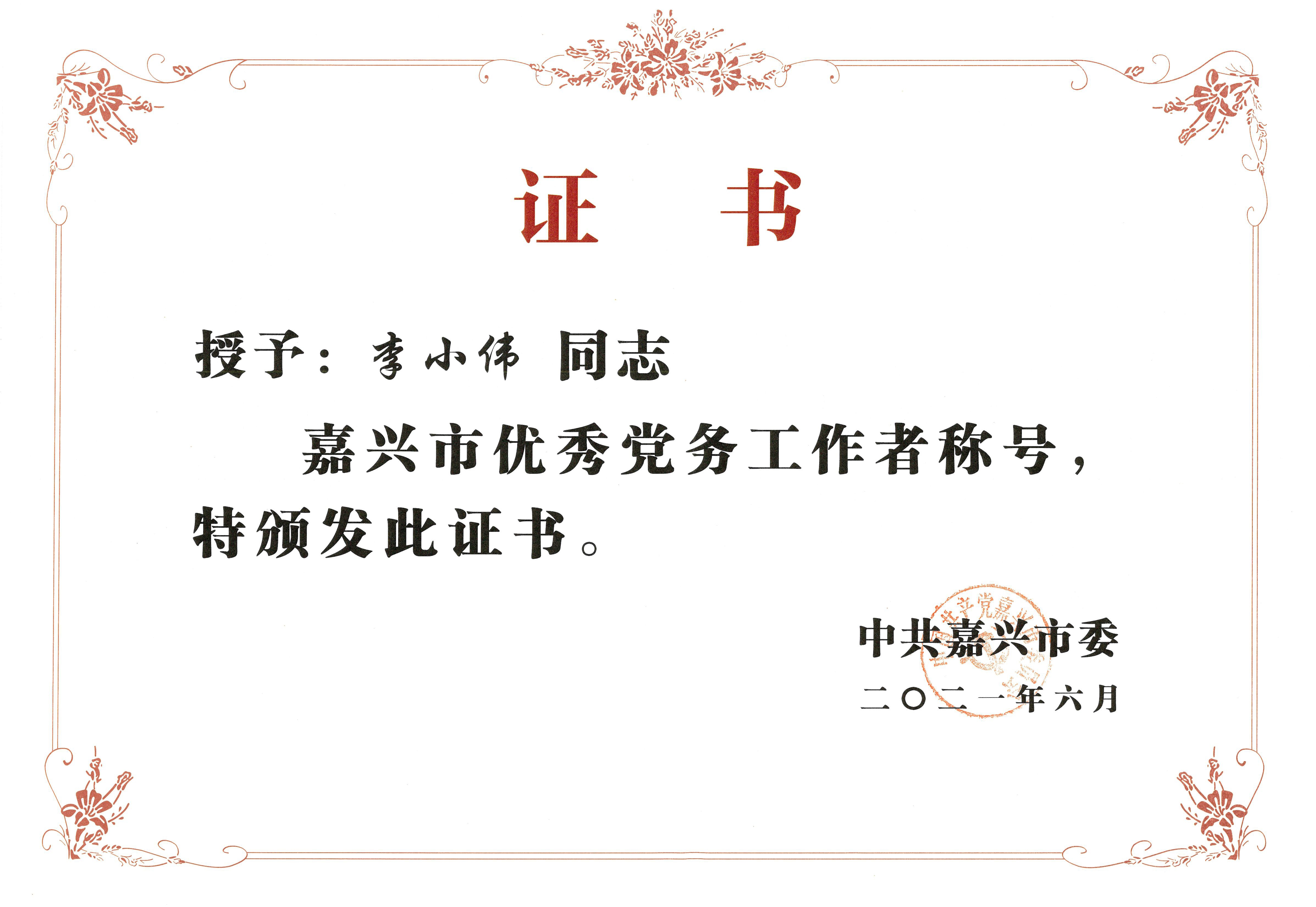建筑分公司李小伟同志获嘉兴市优秀党务工作者荣誉称号
